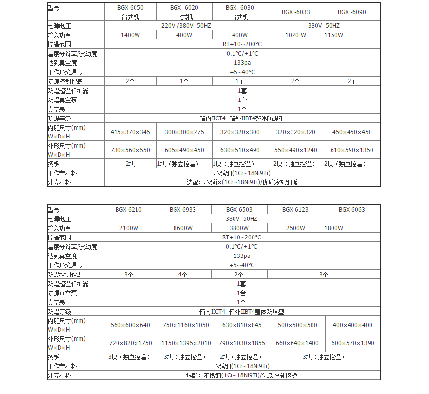 BGX防爆真空干燥箱系列采用304不銹鋼作為工作箱材料。用優(yōu)質冷軋鋼板或304不銹鋼作為外殼材料。